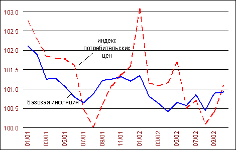 Ускорение инфляции в октябре связано со следующими обстоятельствами: интенсивным расширением денежного предложения во втором и третьем кварталах. Во втором квартале среднемесячный рост налично-денежной массы составлял 105.4%, в третьем – 101.4%. Следствием этого стал ускоренный рост цен на непродовольственные товары, добавивший к показателю инфляции на потребительском рынке 0.3 % пункта; ростом цен на молочные продукты и сахар-песок, имеющим преимущественно сезонную природу. В результате этого индекс потребительских цен увеличился на 0.2 % пункта; ускоренным повышением регулируемых тарифов на платные услуги населению (особенно, пассажирского транспорта). Это добавило к индексу потребительских цен 0.3 % пункта.