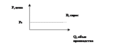Для фирмы в этих условиях спрос полностью эластичен от цены. При расширении объема производства цену, как правило, не меняют. Кривая спроса имеет горизонтальный вид, одновременно является кривой предельного дохода.рис.1. [См.3,с.176]