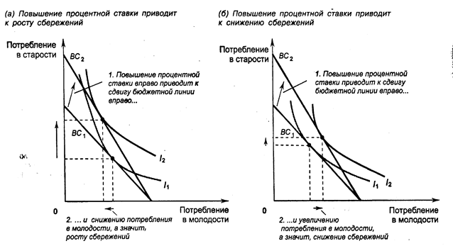 Разумеется, конечный результат будет зависеть от суммарного воздействия обоих эффектов. Если при росте процентной ставки влияние эффекта дохода окажется сильнее воздействия эффекта замещения, Сэм будет увеличивать сбережения. Если же будет превалировать эффект замещения, Сэм уменьшит сбережения. Таким образом, теория потребительского выбора позволяет сделать вывод о том, что рост процентной ставки может способствовать как росту, так и снижению сбережений.