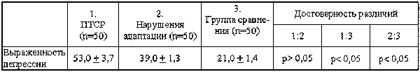 Нами была проведена оценка выраженности депрессивной симптоматики по шкале Цунга. Уровень депрессии по опроснику Цунга достоверно выше (p? 0,05) у больных с ПТСР и нарушениями адаптации по сравнению с группой сравнения и достоверно различается между этими группами (табл. 3).
