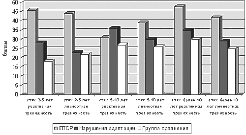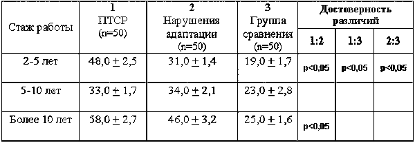 В группе с нарушением адаптации при сопоставлении с группой сравнения отмечается увеличение выраженности клинических проявлений по мере роста стажа работы. Таким образом, в этих группах длительность работы в коммерческой структуре может рассматриваться нами как возможный прогностический фактор.