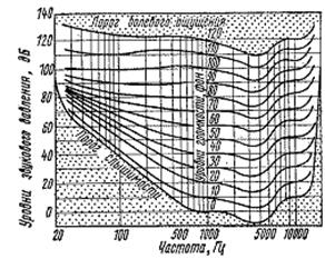 Слуховой аппарат человека обладает разной чувствительностью к звукам различной частоты. Наибольшей чувствительностью - на средних и высоких частотах (800-4000 Гц) и наименьшей - на низких (20-100Гц). Поэтому для физиологической оценки шума используют кривые равной громкости (рис.1), полученные по результатам изучения свойств органа слуха, которые позволяют оценивать звуки различной частоты по субъективному ощущению громкости, т.е. судить о том, какой из них сильнее или слабее.
