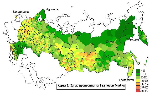 Россия обладает самыми большими в мире запасами леса. На 1993 г. площадь лесной части лесного фонда составляла 886.5 млн.га, а общий запас древесины - 80.7 млрд. м3, что составляет соответственно 21.7 и 25.9% мировых запасов. Превышение второй цифры над первой говорит о том, что Россия располагает более зрелыми и более продуктивными лесами, чем остальная планета в целом.