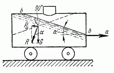 Так как свободная поверхность, как поверхность равного давления, должна быть нормальна к указанной равнодействующей, то она в данном случае представит собой уже не горизонтальную плоскость, а наклонную, составляющую угол α с горизонтом. Учитывая, что величина этого угла зависит только от ускорений, приходим к выводу, что положение свободной поверхности не будет зависеть от рода находящейся в цистерне жидкости. Любая другая поверхность уровня в жидкости также будет плоскостью, наклоненной к горизонту под углом α. Если бы движение цистерны было не равноускоренным, а равнозамедленным, направление ускорения изменилось бы на обратное, и наклон свободной поверхности обратился бы в другую сторону (см. рис.2.6, пунктир).