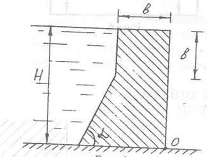 Задача В5. Найти вертикальную и горизонтальную составляющие силы давления воды на 1 м длины платины, а также опрокидывающий момент относительно точки О, если Н = 5 м, b = 1 м, a = 60°.