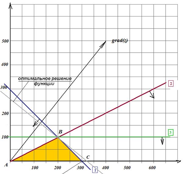 Пересечение указанных полуплоскостей в первой четверти представляет собой треугольник АВСО (заштрихованная общая область для всех ограничений задачи ОДР).