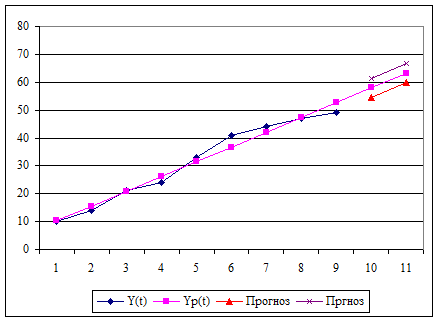 7. Представим графически фактические значения показателя, результаты моделирования и прогнозирования (рис. 2).