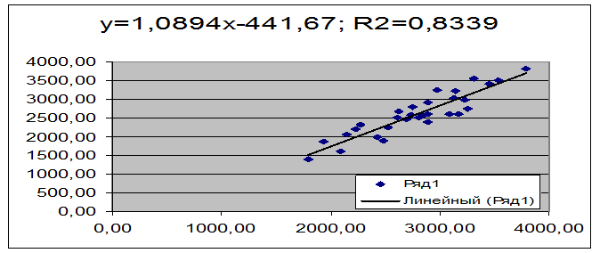 принято линейное уравнение y = 1,0894x - 441,67, совпадающе