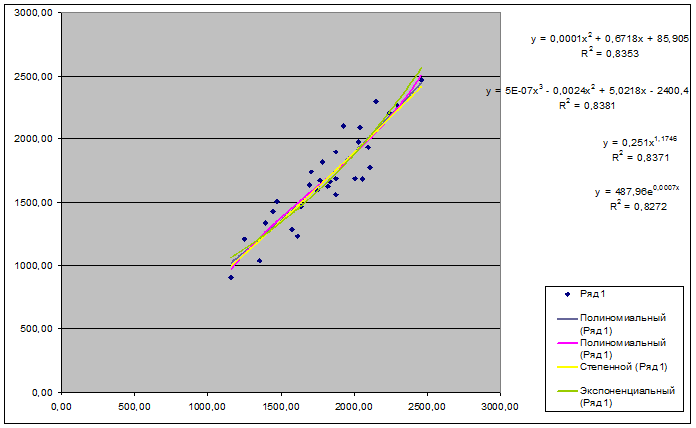 Выбор наиболее адекватного уравнения регрессии определяется максимальным значением индекса детерминации R2: чем ближе значение R2 к единице, тем более точно регрессионная модель соответствует фактическим данным.