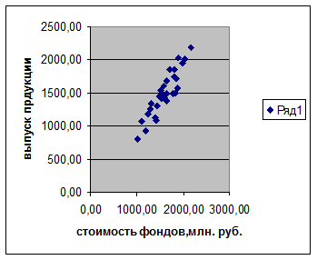 По характеру расположения точек корреляционного поля можно сделать вывод о наличии линейной прямой связи между признаками «среднегодовая стоимость основных производственных фондов» (признак Х) и «выпуск продукции» (признак У).