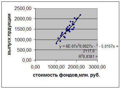 Максимальное значение коэффициента детерминации R² определяет вид наиболее адекватного уравнения регрессии. Таким образом, наиболее адекватная модель регрессии – полином 3-го порядка (Рис. 3).