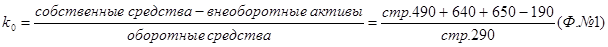 Коэффициент обеспеченности собственными оборотными средствами показывает, какая часть оборотных активов сформирована за счет собственных источников, или характеризует финансовую устойчивость организации в области формирования оборотных активов.
