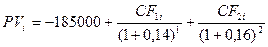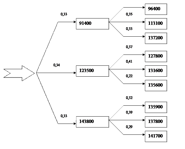 Требуется построить дерево решений для оценки риска и определить привлекательность инвестиционного проекта, рассчитанного на два года. Проект требует первоначальных вложений 185000 USD и финансируется за счет банковской ссуды. Ожидается, что процентная ставка будет меняться по годам следующим образом:14%, 16%. Распределение вероятностей денежного потока представлено в табл.2.