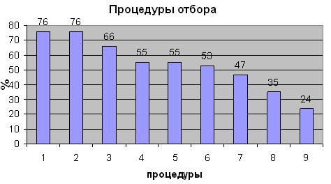 - наиболее используемой процедурой при найме на работу является собеседование и анализ документов и совсем не используются современные методы отбора и найма персонала;