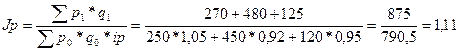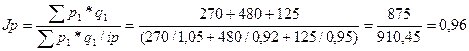 3. Так как мы располагаем только данными о стоимости приобретенных товаров в базисном и отчетном периоде и индивидуальными индексами цен, то применяем преобразованную формулу агрегатного индекса физического объема: