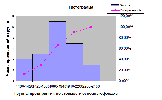 Вывод: Предприятия выборочной совокупности по среднегодовой стоимости основных фондов имеют следующую структуру: 4 предприятия имеют среднегодовую стоимость основных фондов в пределах 1160-1420 млн. руб., 5 предприятий – 1420-1680 млн. руб., 11 – 1680-1940 млн. руб., 7 – 1940-2200 млн.руб. и 3 предприятия – 2200-2460 млн. руб.