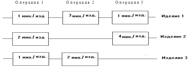 Фирма выпускает три вида продукции (изделий). В процессе производства используются три технологические операции. На рис. 1 показана технологическая схема производства изделий видов 1, 2 и 3. При изготовлении изделия 2 технологическая операция 2 не выполняется, а при производстве изделия 3 используются только технологические операции 1 и 2. В прямоугольниках на рис. 1 указана длительность технологических операций при изготовлении изделия каждого вида.