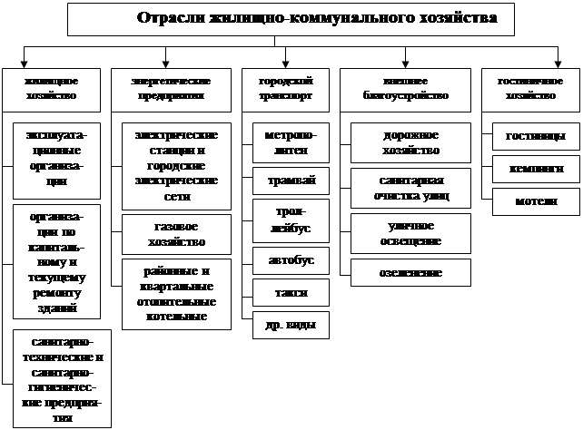 Жилищно-коммунальное хозяйство, в свою очередь, делится на ряд отраслей: жилищное хозяйство (эксплуатационные организации, организации по капитальному и текущему ремонту зданий, санитарно-технические и санитарно-гигиенические предприятия – водопровод, канализация, бани, прачечные); энергетические предприятия (электрические станции и городские электрические сети, газовое хозяйство, районные и квартальные отопительные котельные); городской транспорт (метрополитен, трамвай, троллейбус, автобус, такси и другие виды местного транспорта); внешнее благоустройство (дорожное хозяйство, санитарная очистка улиц, озеленение, уличное освещение); гостиничное хозяйство (гостиницы, кемпинги и мотели). Более наглядно состав отраслей жилищно-коммунального хозяйства представлен на рис. 1.