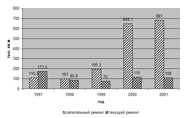Более наглядно данные ремонте дорог, тротуаров, площадей в 1997-2001 гг. представлены на рис. 2.5.