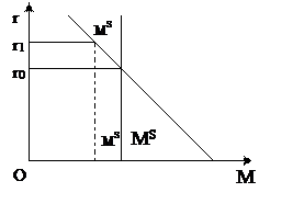 Предложение денег организует государство, выполняя известные функции в рыночной экономике. Этим занимается центральный банк как путем денежной эмиссии так и посредством управления денежными активами других банков. Исходя из проводимой экономической политики, государство устанавливает определенную величину предложения денег, которая не зависит от нормы процента (r). Поэтому кривая предложения денег имеет вертикальный вид.