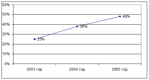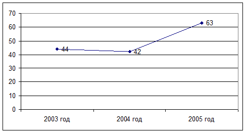 Таким образом, можно отметить резкий рост нагрузки на одного сотрудника в 2005 году, величина которой возросла в 1,5 раза по сравнению с 2004 годом (63/42) (рисунок 2.5).