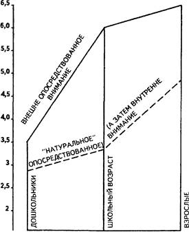 чается в том, что при помощи взрослого ребенок усваивает ряд искусственных стимулов-средств (знаков), посредством которых он дальше направляет свое собственное поведение и внимание. Процесс возрастного развития внимания по идеям Л.С.Выготского представил А.Н.Леонтьев (рис. 1). Из графика, изображенного на этом рисунке, видно, что с возрастом внимание ребенка улучшается (пунктирная линия), однако развитие внешне опосредствованного внимания идет гораздо быстрее, чем его развитие в целом, тем более натурального внимания. При этом в школьном возрасте наступает перелом в развитии, который характеризуется тем, что первоначально внешне опосредствованное внимание постепенно превращается во внутренне опосредствованное, и со временем эта последняя форма внимания занимает, вероятно, основное место среди всех его видов.