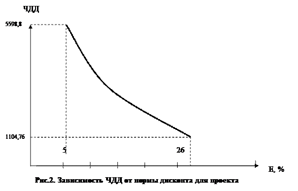 Построим графическую зависимость ЧДД от нормы дисконта. По оси (Х) отложим значение нормы дисконта – 5, 15, 26 по оси (У) значение ЧДД. Значение Е, при котором ЧДД равно «0» и является внутренней нормой доходности – ВНД.
