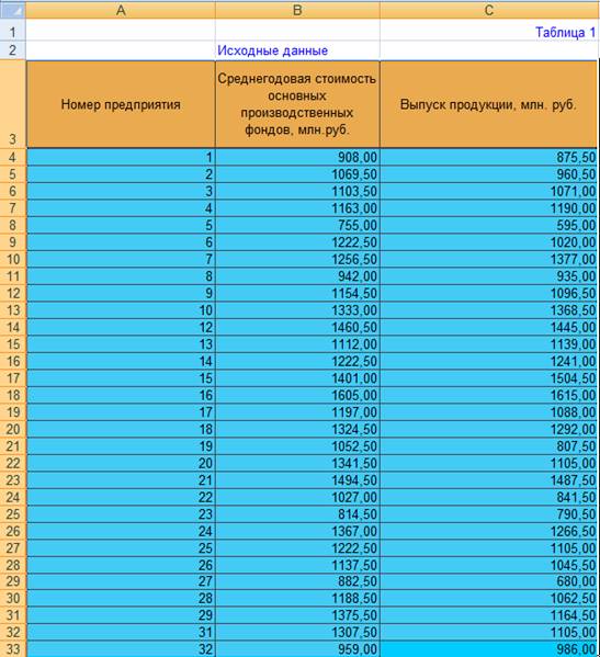 При проведении статистического наблюдения за деятельностью предприятий корпорации получены выборочные данные по 32-м предприятиям, выпускающим однородную продукцию (выборка 10%-ная, механическая), о среднегодовой стоимости основных производственных фондов и о выпуске продукции за год.