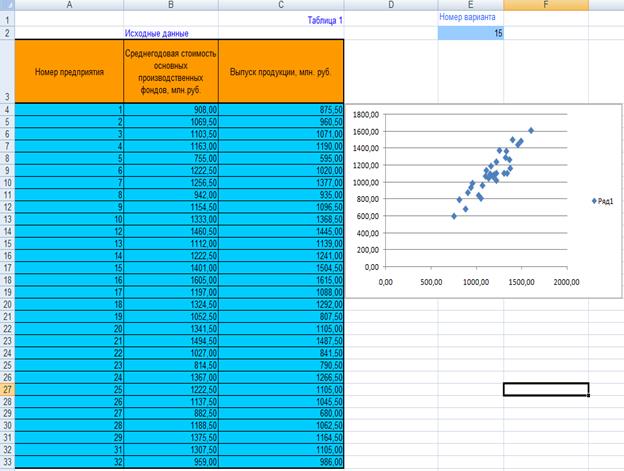В проводимом статистическом исследовании обследованные предприятия выступают как единицы выборочной совокупности, а показатели Среднегодовая стоимость основных производственных фондов и Выпуск продукции – как изучаемые признаки единиц.