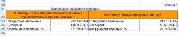 Вывод: Анализируя значения коэффициентов вариации Vσ для признаков среднегодовая стоимость основных производственных фондов (Vσ=17,42%) и выпуск продукции (Vσ=21,75%). Коэффициент для того и другого признака Vσ £40%, следовательно, степень колеблемости незначительная. Значение Vσ не велико (Vσ<33%) , следовательно, индивидуальные значения признака xi мало отличаются друг от друга, единицы наблюдения количественно однородны по данному признаку.