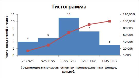 Вывод: Согласно таблице 7, можно сделать вывод о доле предприятий, входящих в каждый из 5 интервалов (табл.7): 1) 755-925 – 4 предприятия (13,33%); 2) 925-1095 – 5 предприятий (30%); 3) 1095-1265 – 11 предприятий (66,67%); 4) 1265-1435 – 7 предприятий (90%); 5) 1435-1605 – 3 предприятия (100%);. Анализируя данную закономерность, можно судить о том, что на долю последнего интервала (интервала с более высокой стоимостью основных фондов) приходится наименьшее число предприятий – 11 (66,67%); на первый интервал ( с более низкой стоимостью основных фондов) – 4 предприятия (13,33%). Т.е. большая часть предприятий в данной совокупности имеет наиболее характерные для всей совокупности в целом значения; меньшая часть предприятий имеет более высокую стоимость основных производственных фондов.