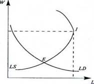 В точке Е спрос на труд равен предложению труда, т.е. рынок труда находится в равновесии. До точки 1 кривая LS показывает увеличение предложения труда при росте заработной платы, однако, пройдя ее, меняет свое направление и снова приближается к оси ординат.