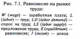 Равновесие на рынке труда означает, что все предприниматели, согласные платить заработную плату W на уровне точки Е, находят на рынке необходимое количество труда, их спрос на труд удовлетворен полностью. Полностью трудоустроены и все работники, готовые предложить свои услуги при этом же уровне заработной платы. Поэтому точка Е определяет положение полной занятости (категория занятости является одной из основных макроэкономических переменных).