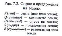 Принцип установления ренты, или арендной платы (эти два понятия часто используют как синонимы), такой же, как и равновесной цены в случае других факторов производства. Если уровень арендной платы повысится выше точки Е (см. рис. 7.2), предложение земли превысит спрос на нее, земельные собственники станут испытывать трудности со сдачей земли в аренду и будут вынуждены снизить уровень арендной платы.