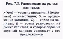 Графически предложение капитала можно представить кривой, имеющей положительный наклон, что обусловлено сущностью процента, заключающейся в следующем. Субъекты, предлагающие капитал, по сути, отказываются от самостоятельного альтернативного его применения: открывать собственное дело и получать доход; покупать землю и получать ренту, поехать отдыхать на престижный курорт (получить полезность). Таким образом, процент — это своеобразная равновесная цена, которая складывается в точке пересечения кривых спроса и предложения на капитал и в которой происходит совпадение предельной доходности на капитал и предельных издержек упущенных возможностей (рис. 7.3).