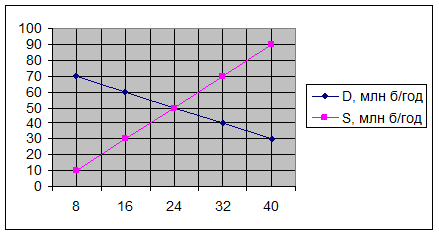 Вывод: равновесная цена (та цена, при которой спрос равен предложению) на рынке кофе – 24 у.е. за банку. Если цена на банку кофе будет выше равновесной, то на рынке будут излишки кофе, если ниже – дефицит.