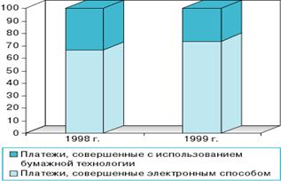 Наибольший удельный вес в 1999 году имели электронные платежи, осуществляемые с применением полноформатных электронных документов, как по количеству (50,9%), так и по сумме (70,4%). Доля платежей, осуществляемых на основании электронных документов сокращенного формата, в 1999 году составила по количеству 46,5%, а по сумме 25,6%. Доля телеграфных и почтовых платежей незначительна: она составила по количеству 0,4 и 2,2%, по сумме - 3,1 и 0,9% соответственно.