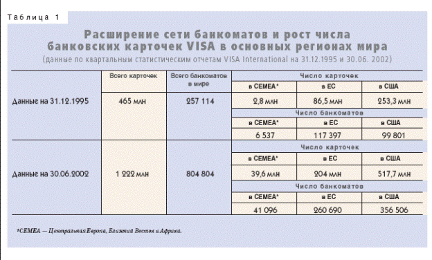 Анализ данных, приведенных в таблице 1, показывает прямую зависимость объемов эмиссии банковских карточек от расширения сети банкоматов. Если в мире за 7 лет количество пользователей карточек VISA выросло на 262,7%, то число банкоматов в 3,13 раза. За этот же период, как видно из таблицы 1, количество держателей банковских карт VISA в США возросло на 204,4%, а число банкоматов на 357%. При этом в Соединенных Штатах в середине 2002 года более 5 млн. предприятий торговли принимали к оплате карточки, и, казалось бы, нет необходимости расширять сеть выдачи наличных. Данная таблица определяет прямую зависимость успехов эмиссии карточек от количества устанавливаемых банкоматов в стране или регионе.
