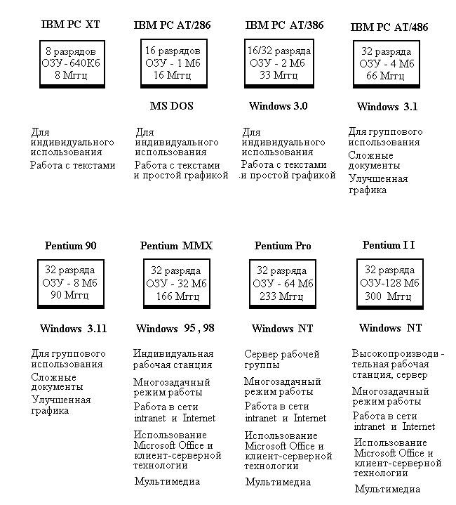 На смену операционной системе MS DOS с ее графическими оболочками Windows 3.1 и Windows 3.11 пришли полноценные операционные системы семейства Microsoft Windows (сначала Windows 95, затем Windows 98, Windows Millennium, Windows 2000 и Windows XP). На рисунке показаны этапы развития персональных компьютеров класса РС и операционной системы Windows: