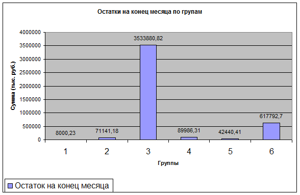 Как видно из диаграммы, наибольшие остатки средств приходятся на 3-ю и 6-ю группу. Наименьшие остатки средств приходятся на 1-ю и 5-ю группу.