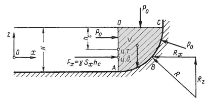 Пусть жидкость заполняет резервуар, правая стенка которого представляет собой цилиндрическую криволинейную поверхность АВС (рис.1), простирающуюся в направлении читателя на ширину b. Восстановим из точки А перпендикуляр АО к свободной поверхности жидкости. Объем жидкости в отсеке АОСВ находится в равновесии. Это значит, что силы, действующие на поверхности выделенного объема V, и силы веса взаимно уравновешиваются.
