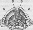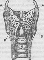 Гортань (А) является продолжением дыхательного горла (Б). Она образована четырьмя хрящами, в пространстве между которыми расположены в горизонтальной плоскости голосовые связки. Голосовые связки (В) представляют собой две эластичные мышцы, которые приводятся в колебательное движение током воздуха, выходящего из дыхательного горла. Голосовые связки благодаря своему расположению и подвижности хрящей, к которым они прикреплены, могут осуществлять изменения двоякого рода. Во-первых, голосовые связки могут натягиваться или оставаться ненатянутыми. Во-вторых, они могут быть сомкнуты между собой или расходиться своими концами так, что между ними образуется пространство, называемое голосовой щелью. Благодаря этим особенностям происходит следующее: если голосовые связки натянуты и сближены между собой, т.е. голосовая щель закрыта, то выдыхаемый воздух, прорываясь между обращенными друг к другу краями связок, приводит их в колебательное движение, которое образует голосовую волну; если же связки не натянуты и голосовая щель не закрыта, то воздух проходит свободно, не вызывая никакого звука.