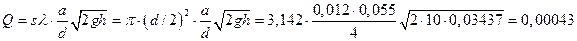 Тогда скорость течения воды через отверстие в поршне найдется так:
