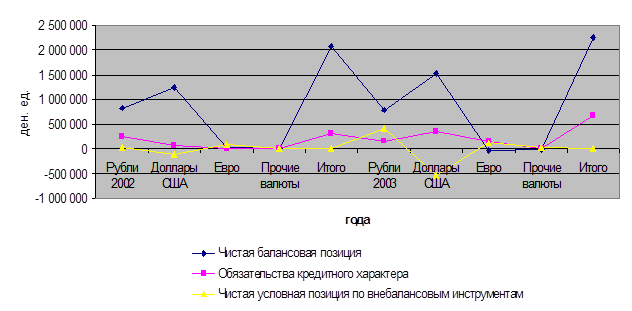 По данным анализа валютного риска видно, что чистая балансовая позиция в рублях в 2003 г. снизилась на 26 561 руб. и составила 796 411 долл. США, что составляет 97% уровня 2002 г. Чистая балансовая позиция в долл. США увеличилась на 295 694 долл. США и составила 1 535 313 долл. США, что на 124% выше уровня 2002 г.