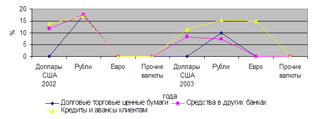 Процентные ставки по кредитам и авансам клиентов в рублях снизились с 17,1% в 2002 г. до 15,4% в 2003 г. Процентные ставки по кредитам и авансам клиентов в долл. США снизились с 13,8% в 2002 г. до 11,6% в 2003 г.