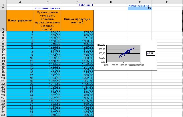 В проводимом статистическом исследовании обследованные предприятия выступают как единицы выборочной совокупности, а показатели Среднегодовая стоимость основных производственных фондов и Выпуск продукции – как изучаемые признаки единиц.