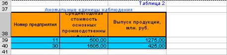 Вывод: В результате проведённых исследований среди исходных данных было выявлено наличие резко выделяющихся признаков, так называемых «аномальных единиц» - предприятия, статистические показатели которых сильно отличаются от всей совокупности в целом. Данные аномалии могут нарушить статистическую закономерность изучаемого явления. Поэтому для более точного анализа совокупности необходимо было исключить их из исходных данных (предприятия № 11 и 30) (табл. 2)