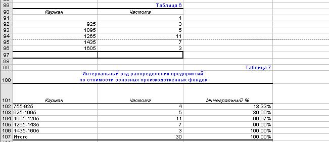 Вывод: Согласно таблице 7, можно сделать вывод о доле предприятий, входящих в каждый из 5 интервалов (табл.7): 1) 755-925 – 4 предприятия (13,33%); 2) 925-1095 – 5 предприятий (30%); 3) 1095-1265 – 11 предприятий (66,67%); 4) 1265-1435 – 7 предприятий (90%); 5) 1435-1605 – 3 предприятия (100%);. Анализируя данную закономерность, можно судить о том, что на долю последнего интервала (интервала с более высокой стоимостью основных фондов) приходится наименьшее число предприятий – 11 (66,67%); на первый интервал ( с более низкой стоимостью основных фондов) – 4 предприятия (13,33%). Т.е. большая часть предприятий в данной совокупности имеет наиболее характерные для всей совокупности в целом значения; меньшая часть предприятий имеет более высокую стоимость основных производственных фондов.
