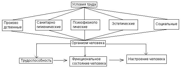 Из схемы следует, что условия труда на каждом рабочем месте — это синтез по крайней мере пяти их видов: производственных, санитарно-гигиенических, психофизиологических, эстетических и социальных. Данные условия представляют собой совокупность факторов, определяющих состояние производственной среды и оказывающих влияние на здоровье и работоспособность человека. [1, 109]