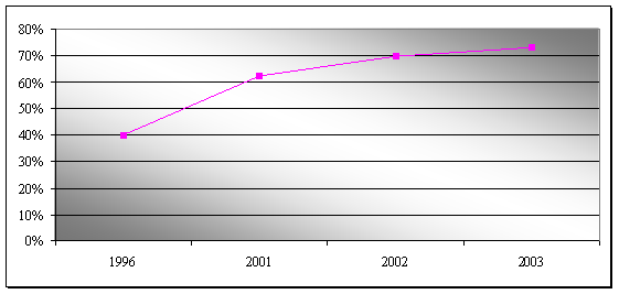 Рассматривая вопрос о российском производстве, следует отметить, что за последние годы на рынке макарон отмечается тенденция роста, которая наблюдается с 1996 г., где благоприятное влияние оказал и августовский кризис, когда большинство потребителей вынуждено было переориентироваться на дешевые продукты. Однако уровень 1991 г. (после которого вплоть до 1996 г. наблюдался существенный спад производства, что оценивалось в 1996 г. примерно в 40% от объема выпуска 1991 г.) так и не был достигнут. На рис. 1. показана тенденция роста производства макаронной продукции российскими предприятиями, начиная с 1996 г., данные приведены в %-х к объему производства в 1991 г. (1 115 000 т.)